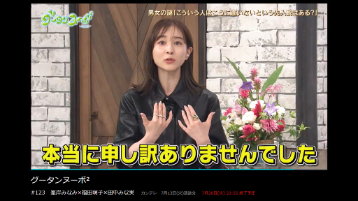 番組終盤、スタジオで「先入観」にまつわるトークが展開され、田中はその流れで「この番組で『ゲームをするイスを持ってる人はちょっと彼氏にするのヤだな』って言ったんですけど、思わぬところでそれがプチ炎上したらしくて」と告白。続けて、田中は「私、SNSやってないから、スタッフさんから(炎上を)聞いたんですけど。それは本当に申し訳ありませんでした!」とカメラ目線で謝罪した。