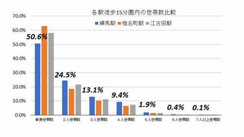 上記のグラフは「練馬駅」と「椎名町駅」、「江古田駅」の世帯数の比較です。練馬駅は、他の駅と比べ、2人以上世帯の割合が高く、ファミリー層が多い傾向が分かりました。