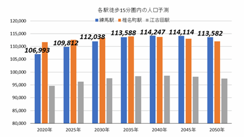 2050年までの人口の増加予想数を確認すると、練馬駅は6,589人となっています。椎名町駅も江古田駅も同じような人口推移が予想されています。