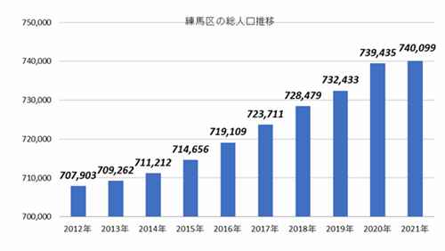 2012年から32,196人(4.5%)増加しています。なお、既述のような要因を踏まえ、練馬区の人口は、2047年まで、現在とほぼ同じ規模の人口を維持しているという予測となっています。