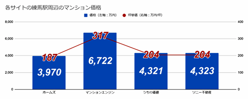 他にも、国土交通省の売買データを基に価格や相場を教えてくれるウチノカチでは、平均価格4,321万円(204万円/坪)でした。最後に、AIを使った評価で業界を引っ張っているソニー不動産は平均価格4,323万円(204万円/坪)でした。ちなみに、どの相場も2021年11月時点の数字です。