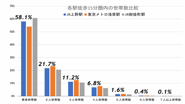 上記のグラフは「上野駅」と「浅草駅」、「御徒町駅」の世帯数比較です。「上野駅」と「御徒町駅」は単身世帯数が多いことがわかります。