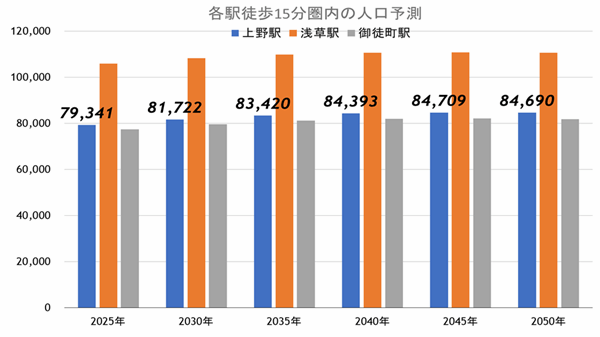 どの駅も2050年に人口の増加数が減少する予想となっているものの、大きな変化は予想されていません。