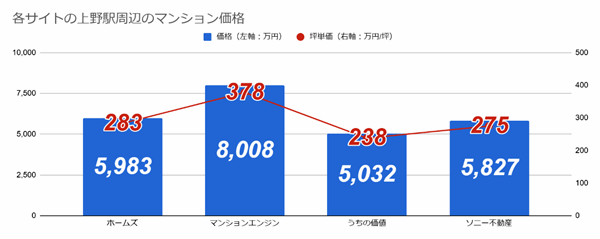 このように堅調に推移している上野駅の住宅価格ですが、さらにいくつかのマンションサイトを参考に、一般的なファミリー向けマンションの価格を調べてみました。一旦、ざっくり知るために築年数や最寄り駅までの距離は考慮外としています。