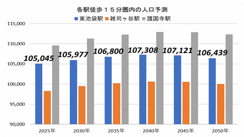 上記は、東池袋駅と徒歩15分圏内の雑司ヶ谷駅・護国寺駅の世帯数を比較したグラフです。