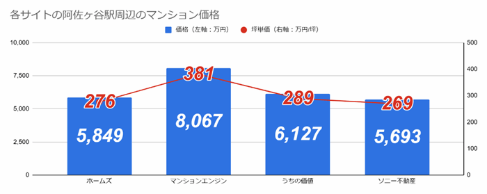 他にも、国土交通省の売買データを基に価格や相場を教えてくれるウチノカチでは、平均価格6,127万円(289万円/坪)でした。最後に、AIを使った評価で業界を引っ張っているソニー不動産は平均価格5,693万円(269万円/坪)でした。ちなみに、どの相場も2021年11月時点の数字です。