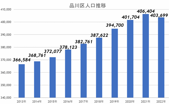 こちらは品川区全体の人口推移を表したグラフです。2021年までは年々上昇傾向にあり、39,820人も増えています。