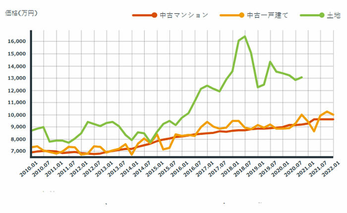 ライフルホームズが発表している『住まいのインデックス』のデータを基に、実際の乃木坂駅周辺の中古マンションや土地に関する価格推移を確認します。