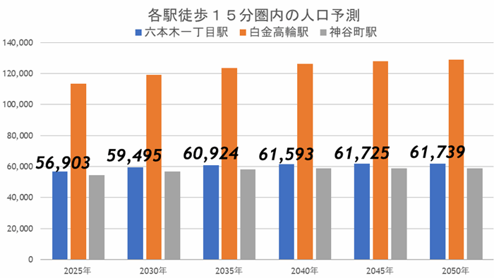 データによると、どの駅も大きな変化は予測されず、六本木一丁目はすぐに減少を気にすることのない手堅いエリアであることがわかります。