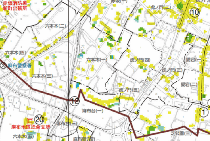六本木1丁目~7丁目までを確認すると、一番危険度の低い地域は1丁目であることがわかります。