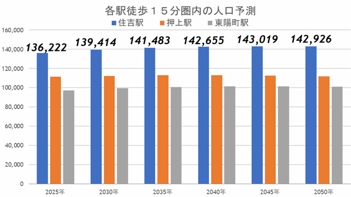 次に、各駅徒歩15分圏内の人口推計のデータを見てみます。