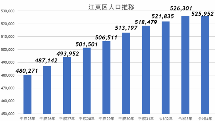 江東区が発表した人口に関する統計データを基に、江東区の人口を考察していきます。データによると2022年に多少減少したものの10年間で45,681人(9.5%)増加していることが分かります。