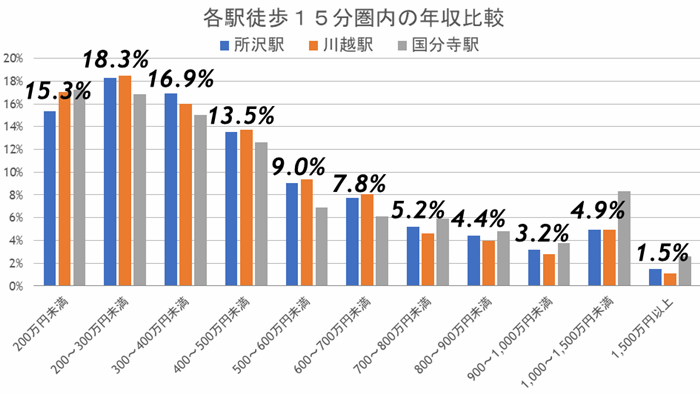 まず、所沢駅と川越駅、国分寺駅の3駅について、年収別世帯数の割合を比較してみました。