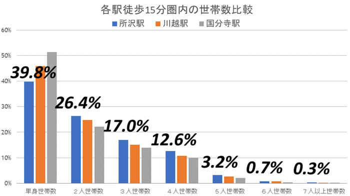所沢駅は2人以上の世帯が他の駅に比べ多いことがわかりました。3人、4人、5人世帯も上回っています。