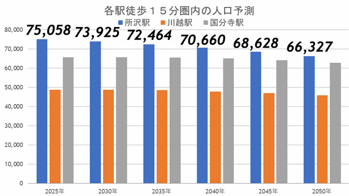 データを確認すると3駅の中で最も早く人口が減少に転じ、その後も減少を続けるのが所沢でした。