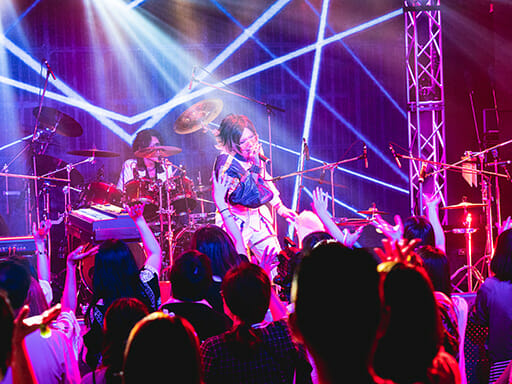 この日のライブは、耳に心地好く響く歌謡メロも印象深い、雄大な景観を描くミドルメロウの『流離人』からスタート。『天下無双』ではフロア中を羽根扇子や手扇子舞うディスコ空間に塗り替えれば、活動初期の名曲『まぶしくて』とコロナ禍以降の時期に作りあげた『待宵影』を並べ、いかにしてHYPER BEAT ROCKが時代へ寄り添いながら変化し続けてきたのかを目の前に映し出していった。
