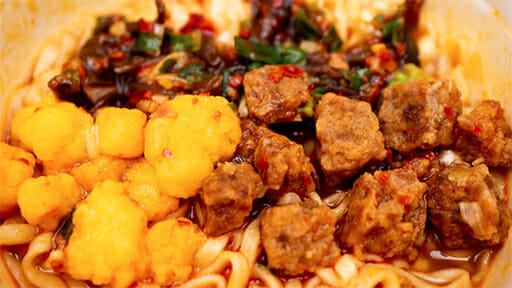 具は両者に共通するものが多く、最も目立っている謎肉やたまごはどちらにも入っている具です。「辛麺」要素は粗挽きの唐辛子、「にんにく豚骨」要素はキクラゲやきざみニンニクで、具は今回の「スーパー合体」4品で最もボリューミー。