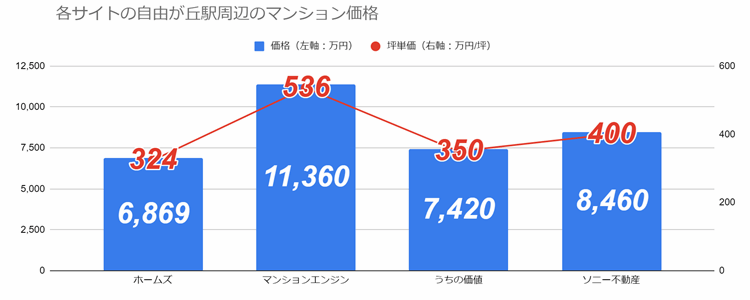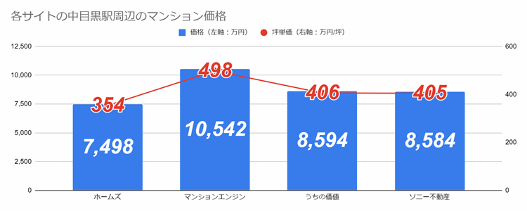 上記を参考に、マンションエンジンの新築価格とその他3つのサイトの平均価格(中目黒駅8,820万円、自由が丘駅7,887万円))を単純に比較すると、中古マンションと新築では、中目黒駅が約12%、自由が丘駅が約47%もの乖離がありました。