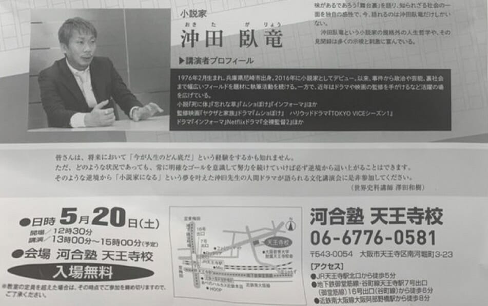 ドラマ化もされ、Netflixで全世界配信中の『インフォーマ』(サイゾー文芸部)の作者である沖田臥竜氏が河合塾で開催する【5月20日、天王寺校/詳細はこちら】。タイトルは「底辺からの逆襲 インフォーマから受験生への伝言」。沖田氏の常識にとらわれぬ人生から生まれた言葉を若者たちに届けるべく、サイゾーも協力体制だ。それにしても、なぜ大手予備校で公演を? 沖田氏がその狙いと想いを綴る――。