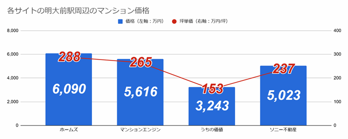 上記を参考に、マンションエンジンの新築価格とその他3つのサイトの平均価格(下北沢駅5,615万円、明大前駅4,785万円)を単純に比較すると、中古マンションと新築では、下北沢駅が約33%、明大前駅が約17%の乖離(かいり)がありました。