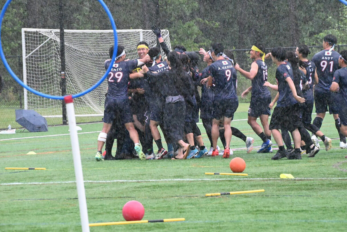 激しい攻防戦の末、井出大輝選手が見事スニッチをキャッチし、日本代表は初勝利を収めた。ピッチ上で抱き合う選手たち。リザーブを含めた25人の選手、そしてスタッフたちに、会場からは大きな拍手が送られた。