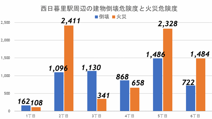 西日暮里1丁目~6丁目までを確認すると、一番危険度の低い地域は5丁目であることがわかります。逆に、1番危険度の高い場所は1丁目でした。