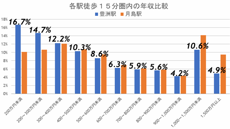 次に、豊洲駅と月島駅の年収別世帯数の割合を比較していきます。
