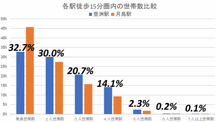 豊洲駅は、2人以上の世帯数が月島駅よりも割合が高いことがわかります。