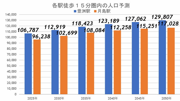 一方の月島駅も、20,790人増加の予想となっており、どちらの駅も今後のタワーマンション建設等、再開発事業による人口増加が数値に反映されていると考えられます。