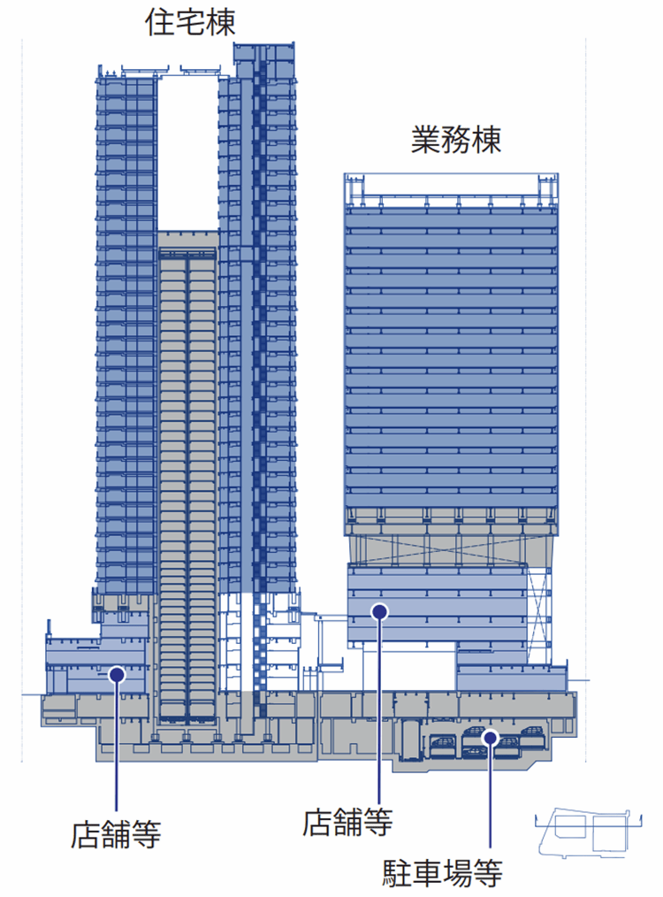 この高層ツインタワーは、地上20階以上の共同住宅用のタワーや商業施設、事業用事務所で構成される計画です。