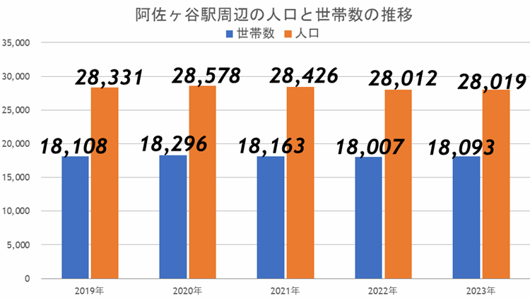 一方の阿佐ヶ谷駅は、世帯数はほとんど変動がないものの、人口は312人減少していることがわかります。