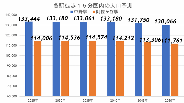 次に、各駅徒歩15分圏内の人口推計のデータを見てみます。