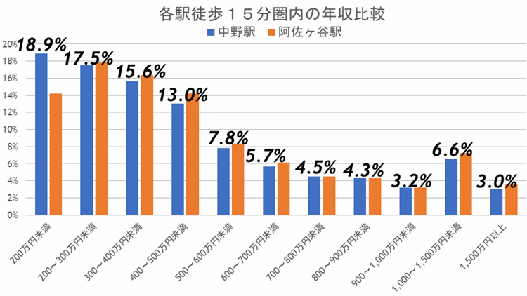 次に、中野駅と阿佐ヶ谷駅の年収別世帯数の割合を比較していきます。