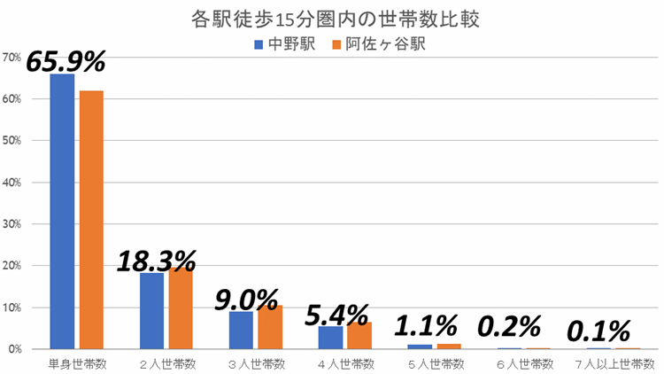 データを確認すると、単身世帯数は中野駅の方が割合が高いことがわかります。