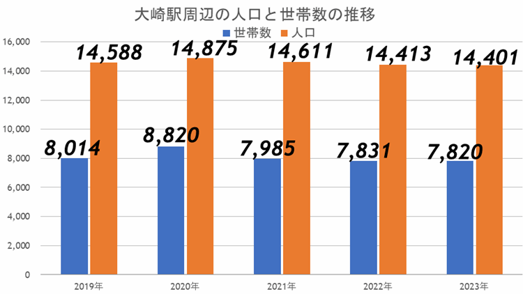 また、大崎駅も同様に、世帯数が194世帯、人口187人減少していることが分かります。
