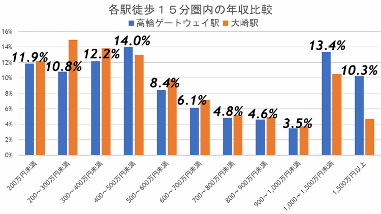 次に、高輪ゲートウェイ駅と大崎駅の年収別世帯数の割合を比較していきます。
