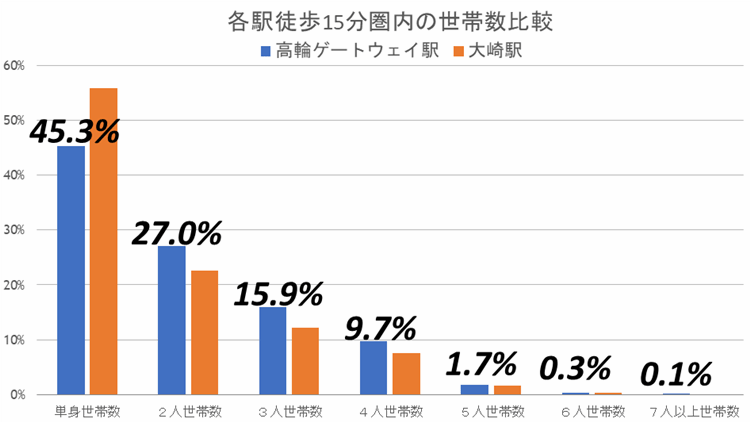 上記のグラフは、高輪ゲートウェイ駅と大崎駅の世帯数を比較したグラフです。