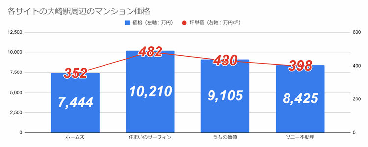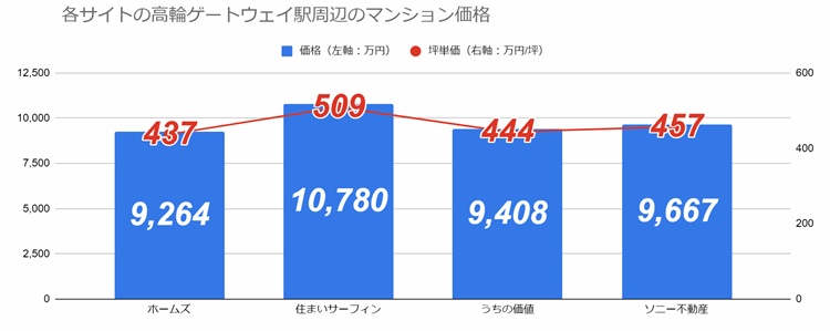 次に、新築マンションの相場に強い住まいサーフィン(https://www.sumai-surfin.com/price/stations-areas/line/)では、高輪ゲートウェイ駅が平均価格1,0780万円(509万円/坪)、大崎駅が平均価格10,210万円(482万円/坪)でした。