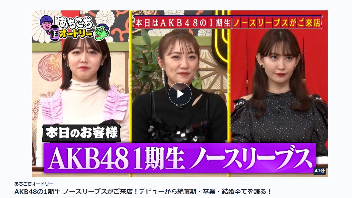 8日放送の『あちこちオードリー』(テレビ東京系)に、AKB48元1期生の小嶋陽菜、高橋みなみ、峯岸みなみが出演。3人がユニット「ノースリーブス」として活動していた時期のエピソードなどでスタジオを盛り上げた。