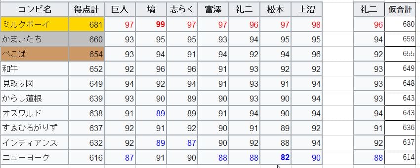 文句なし、圧倒的ににミルクボーイだった19年。松本人志の1番手ニューヨーク82点、2番手かまいたち95点というジャンプアップが目立つが、この年も志らくと「2人目の礼二」を入れ替えたことによる順位の変動はない。