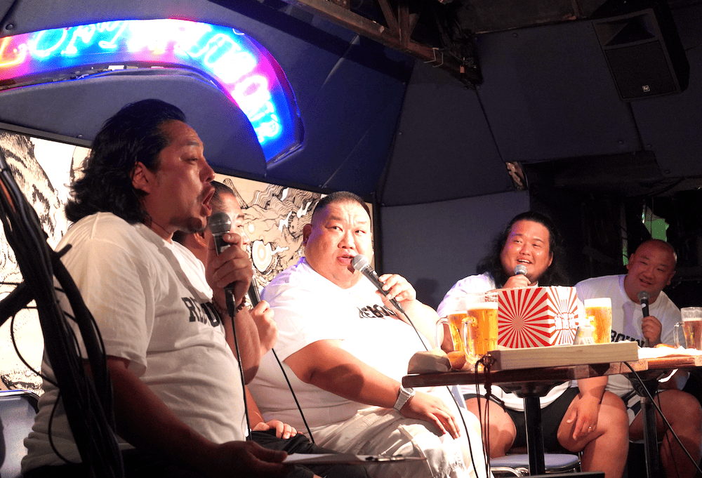 会場となった新宿ロフトプラスワンのステージに登壇したのは、馬山親方役のおむすび、馬剛役の室田真宏、馬狩役の岩元駿介、馬の若役の将軍岡本、馬井口役の井口隆洋。ゲストとして、『サンクチュアリ』の監修を務めた維新力も登場。元関取の維新力が小さく見えるほど、馬山部屋の5人は巨体の持ち主だが、トークは軽妙かつ快活だった。